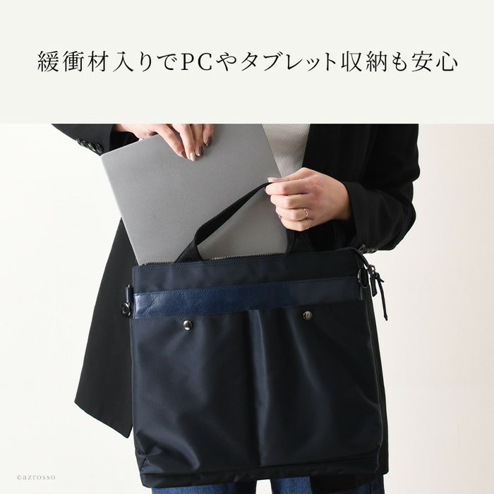 防弾ベストにも使う生地で作られた強靭かつ軽量なPCヘルメットバッグを日本の老舗鞄工房 服部(はっとり)から。きちんと感と軽さを両立するナイロン×牛革仕立て。 2way ヘルメットバッグ 軽量 ナイロン 本革 PC収納 ビジネスバッグ トートバッグ ショルダーバッグ ネイビー 紺 日本製 レディース