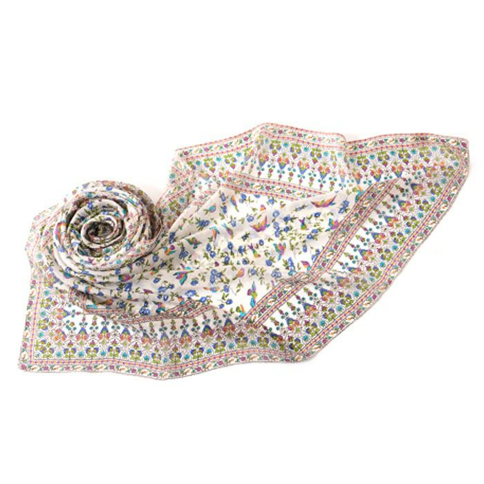 幸運のモチーフ鳥をバロック調にデザインした美しいシルクストール。伝統のシルクスクリーン(手捺染)で染めるカラーズデオトノのストール。ショールとしても使える大判サイズ。母の日プレゼントや誕生日ギフトに シルク100 大判ストール 春夏 ショール COLORS DE OTONO 小鳥 動物 小花柄 バロック柄