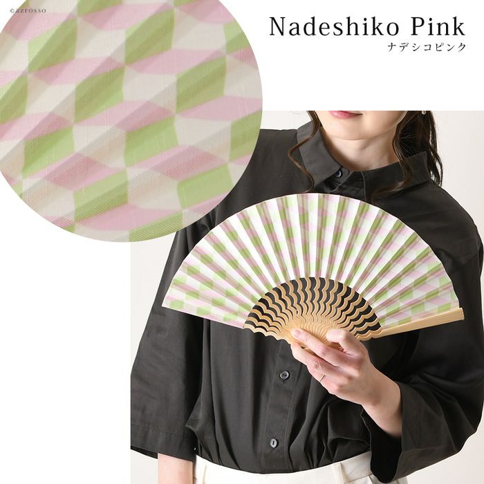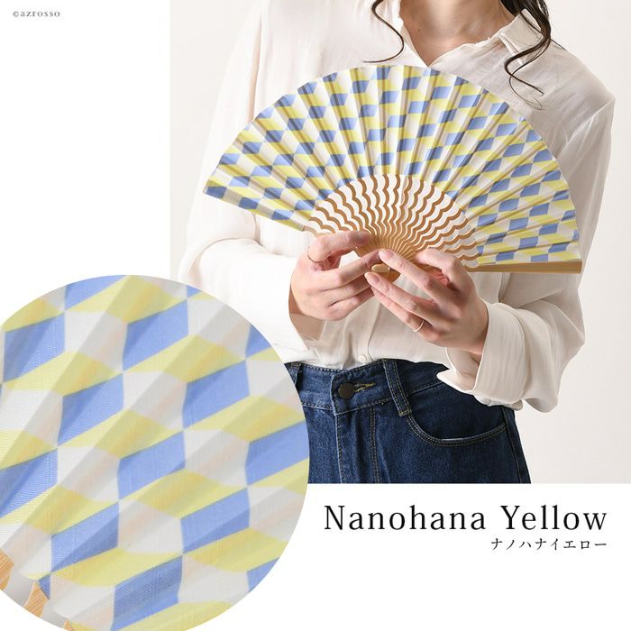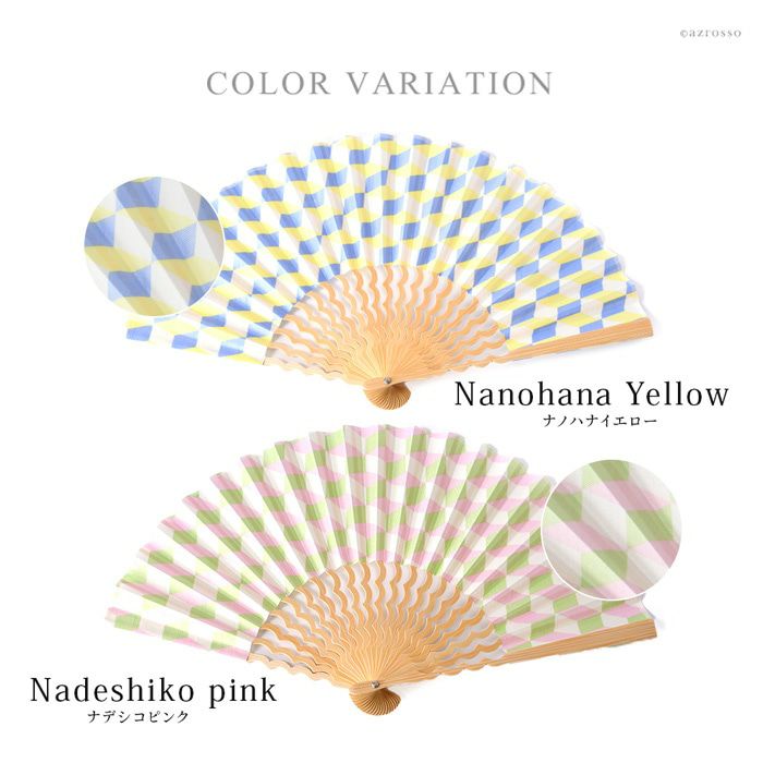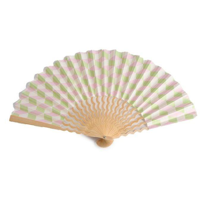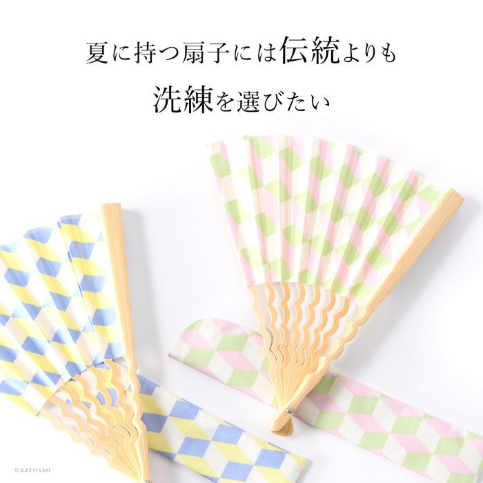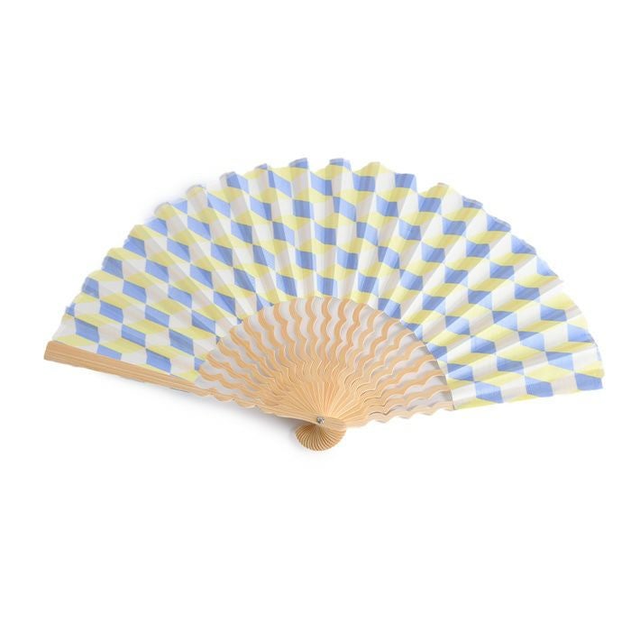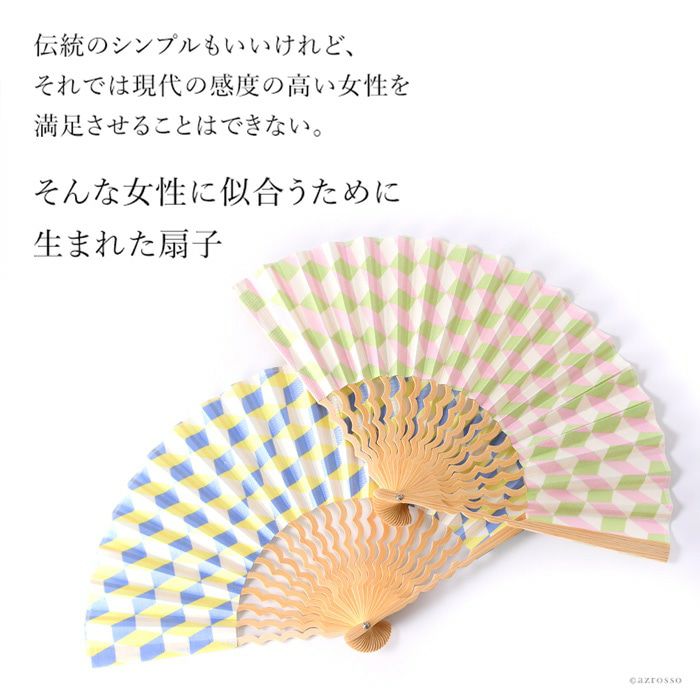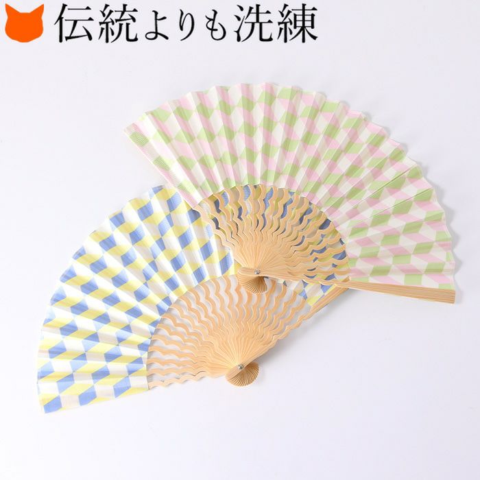 ブロックパターン×補色のスタイリッシュな幾何学柄と、海の上を飛ぶカモメの群れのような美しい曲線を描く中骨がおしゃれな扇子「カモメ」。手にしっくり馴染む定番7寸(21cm)タイプ 幾何学柄 扇子 カモメ 7寸 くるり【通常ネコポス配送】