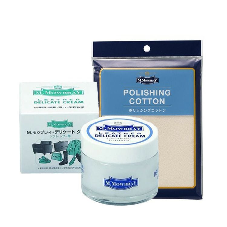 ヨーロッパで人気のシューケアブランド、M.MOWBRAY(モウブレイ)の靴磨き専用のクロス付きの皮革製品の栄養保湿ケアセット。全てのソフトレザー製品に使えるお手入れクリームです。 モウブレイ デリケートクリーム 栄養 保湿 クリーム 靴磨き クロス 皮革 革靴 レザー製品 栄養補給 手入れセット M.モゥブレィ M.MOWBRAY 靴ケア 革製品 お手入れ ソフトレザー スムースレザー ケア クリーム