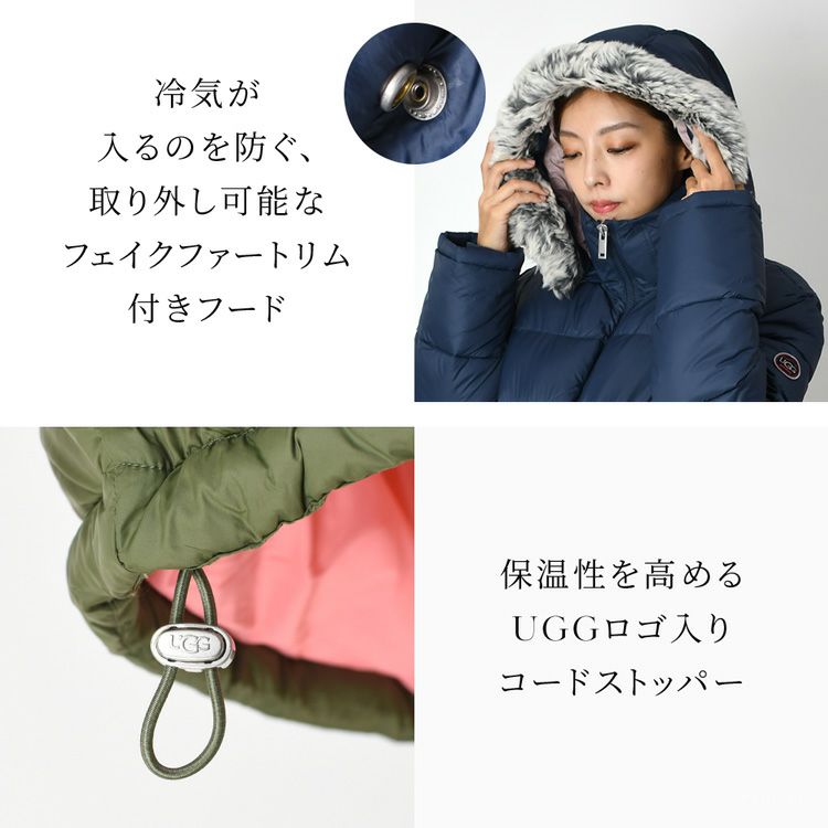 軽くて暖かいUGGミドルレングスパファージャケット。取り外し可能なフェイクファートリム付きフード、ハイジップ、サムホール付きリブ袖、大きめポケットとファッション性と機能性を兼ね備えたアウター 日本未発売 UGG アグ アウター UGG Ozzy Mid-Length Puffer Jacket 中綿ジャケット フェイクファートリム付き フード付き キルティングジャケット 黒 ブラック ネイビー カーキ