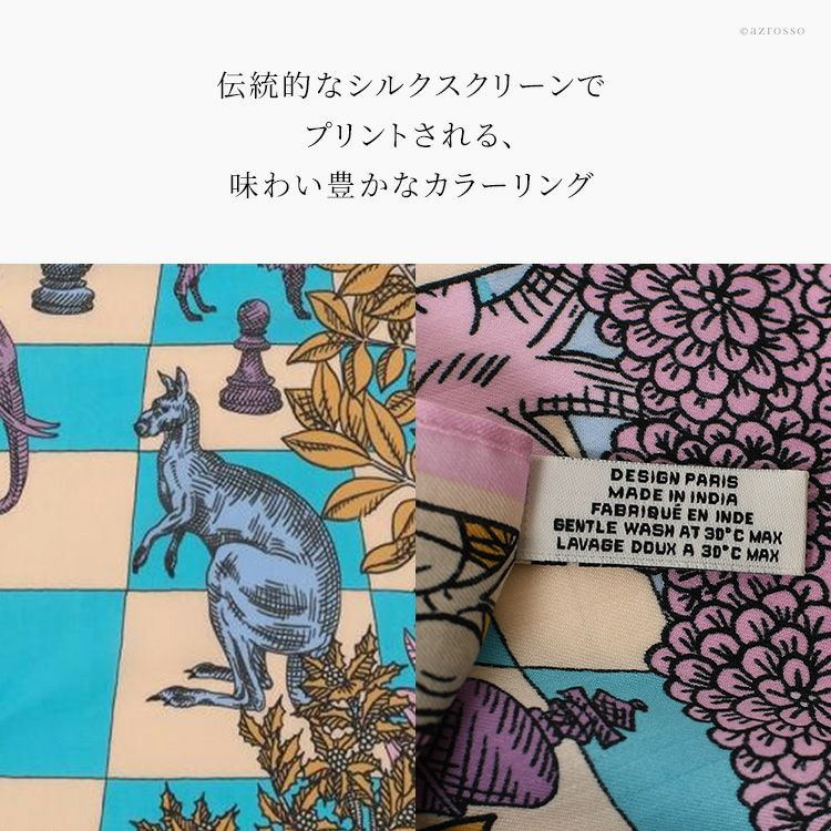 チェス台が動物と植物の楽園になったシュルレアリスム絵画のような一枚。巻き方によって様々な表情を楽しめます。気軽に使える小さめサイズで、なめらかなシルク×コットンが季節問わずに使えて肌触りも抜群。 INOUI EDITIONS MAGNUS イヌイエディションズ スカーフ シルク×コットン 正方形 65×65 アニマル 花柄 ボタニカル イヌイトゥーシュ