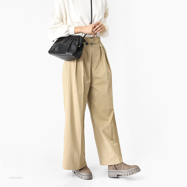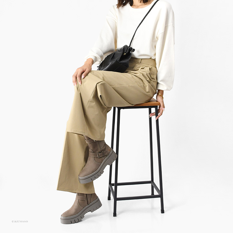 柔らかなトープカラーが放つニュアンスに、ダブルベルトがきりりと効いたミドルブーツ。