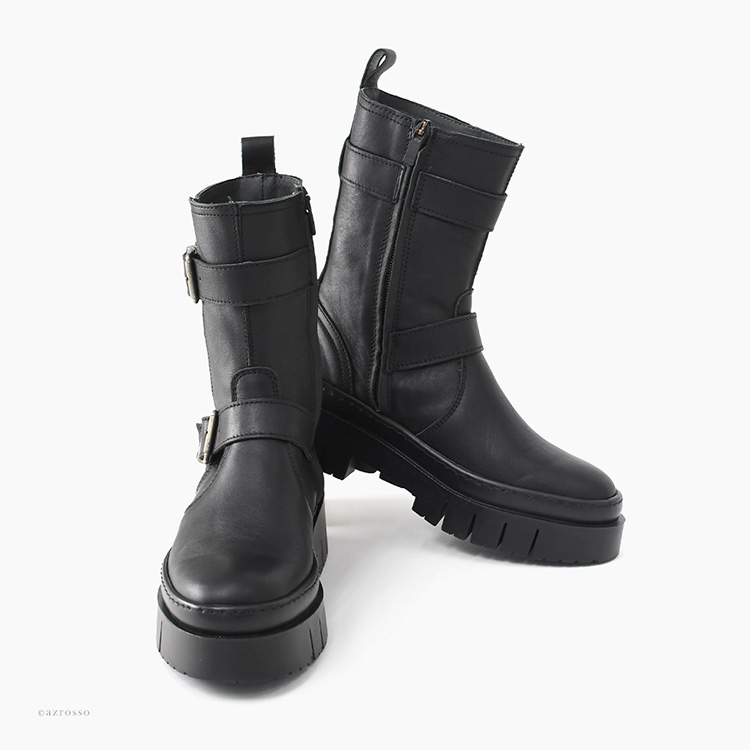 ブラックのシャープさとベルトデザインのアクセントでモードな表情をプラス。