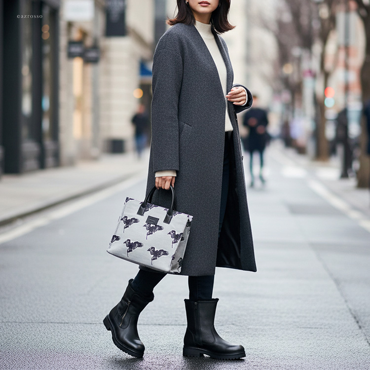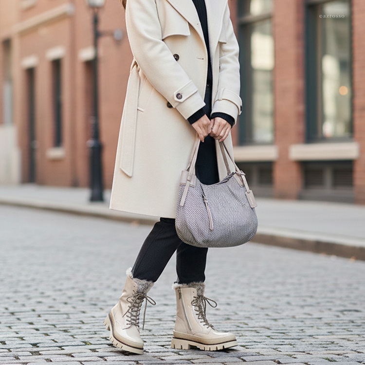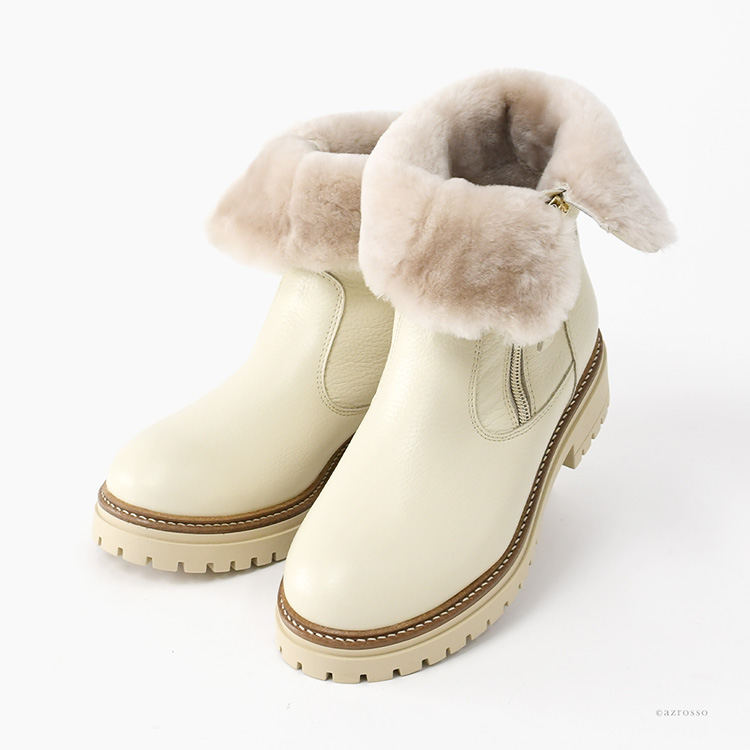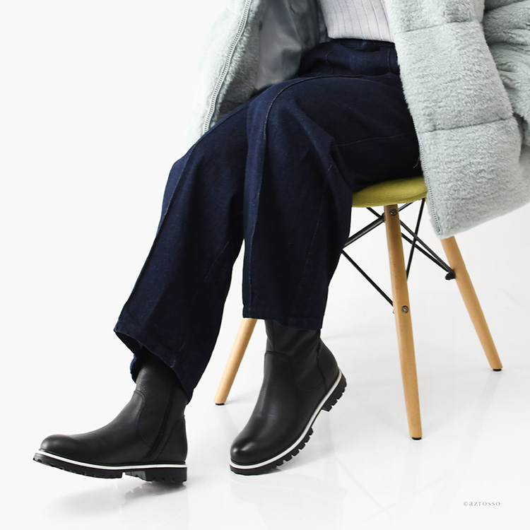 内側は、足先までしっかりムートン仕様。冬の朝、冷え切った足を入れた瞬間に、ふわっと包み込まれるような暖かさなのに外から見た印象は驚くほどすっきり。アッパーには上質なレザーを使用し、撥水加工を施しました。雪の日や濡れた路面でも気兼ねなく履けるうえ、アウトソールは滑りにくさを考慮した設計。スノーブーツとしての安心感を備えながら、あくまで見た目はきれいめなショートブーツです。