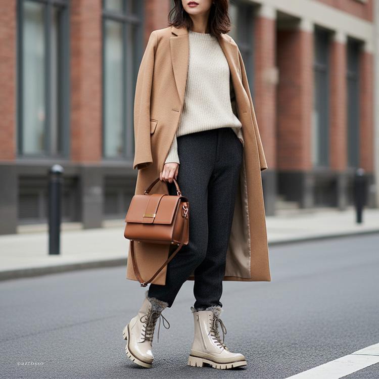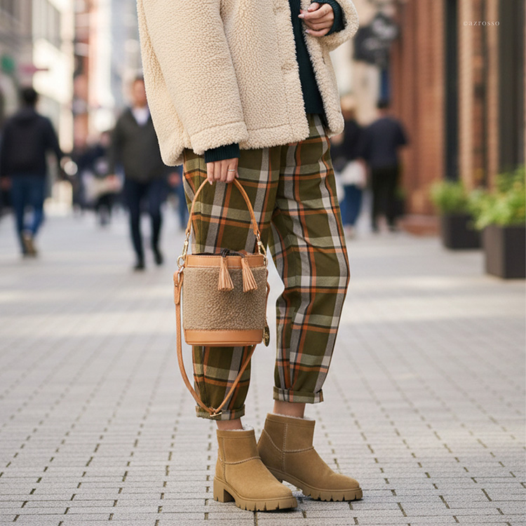 レースアップの雰囲気を楽しみつつ、脱ぎ履きはスムーズ。存在感はありながらも重たくなりすぎず、バランスの取れた設計で、歩きやすさとスタイルアップを両立するムートンブーツです。