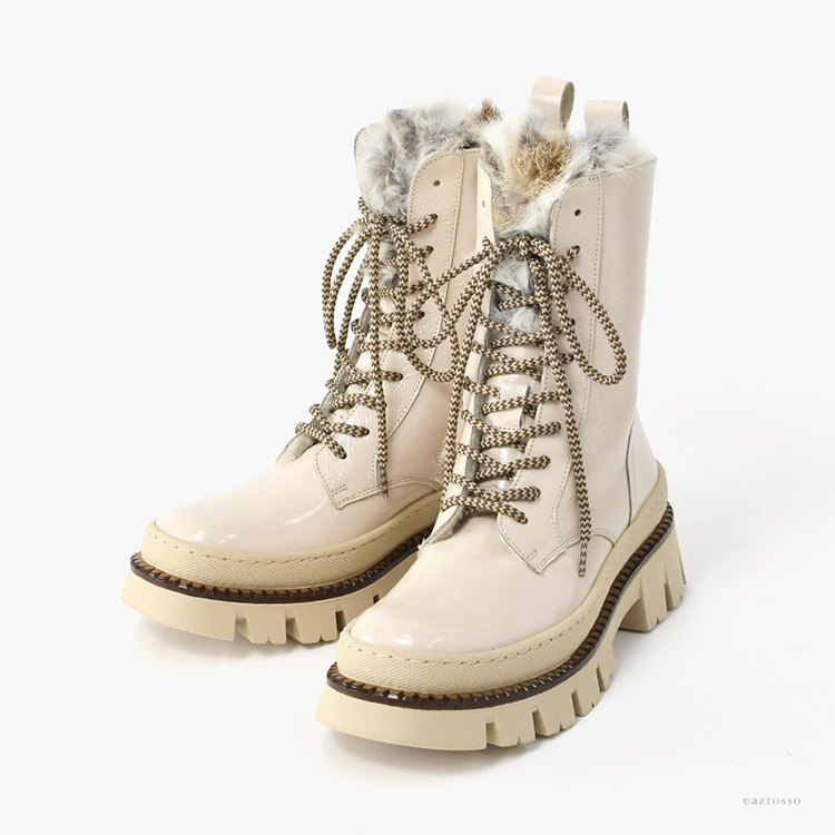 真冬の冷え込む日でも、足全体をやさしく包み込み、長時間履いても暖かさが続きます。編み上げブーツでありながら、斜めに配されたサイドジップを採用。