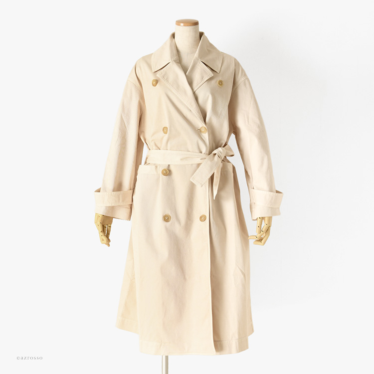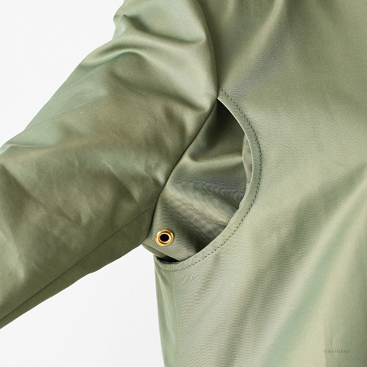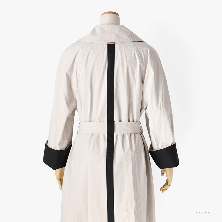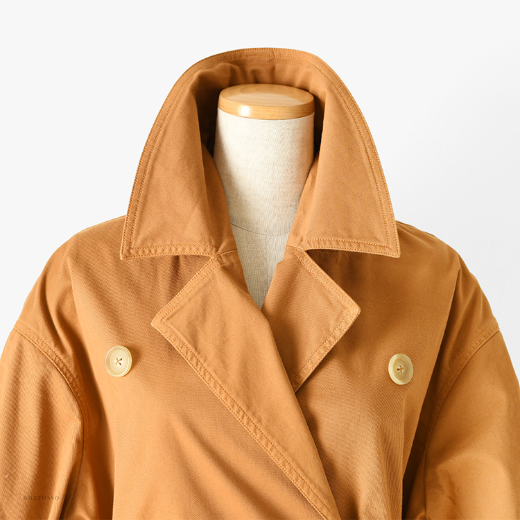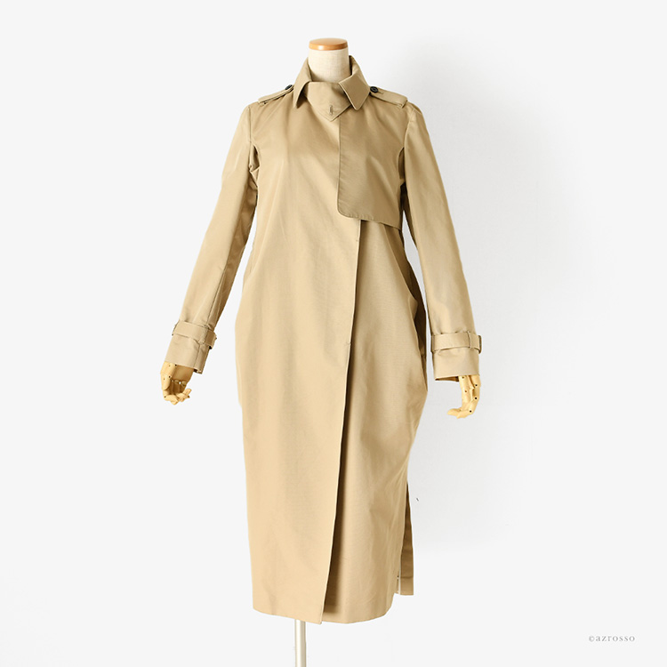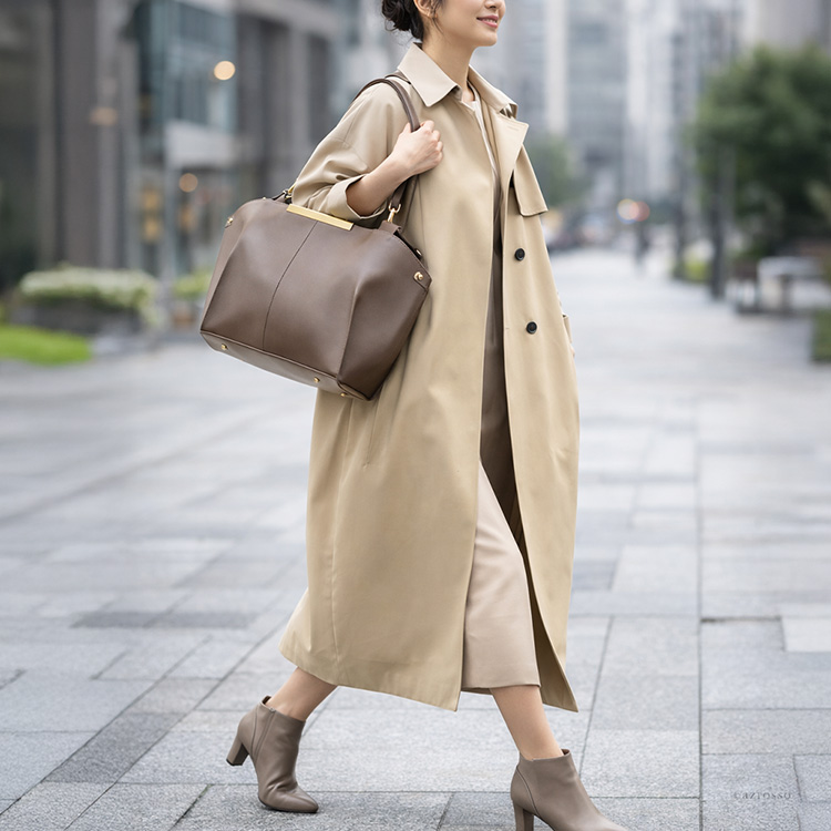 バーバリーやアクアスキュータムにも生地を提供する「スタイルテックス社」のギャバジン生地を使用しており、一目で上質とわかる光沢と品格があります。さらに「強撥水」で雨に強く、脇下の「空気穴」で蒸れにくい機能性は、外回りや通勤など、天候に左右されず働く女性の頼れるパートナーとしておすすめの1着。