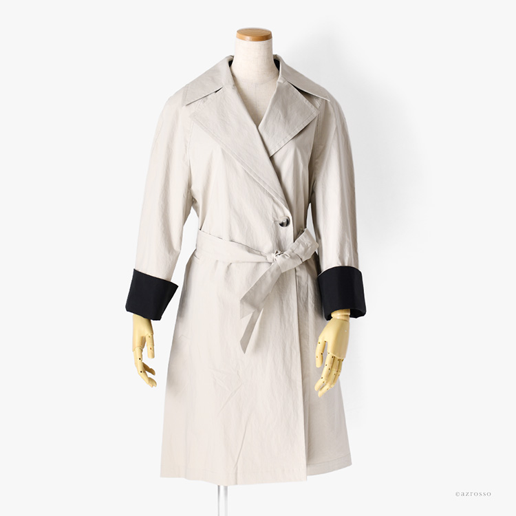 パリの高級コート専門ブランドによる、ブラック×ベージュのバイカラーが印象的な一着です。後ろ姿や袖口のデザイン性が高く、ただ羽織るだけで「人とは違う」洗練されたスタイルが完成します。アート鑑賞や表参道でのショッピングなど、おしゃれをして出かけたい特別な休日にマッチします。
